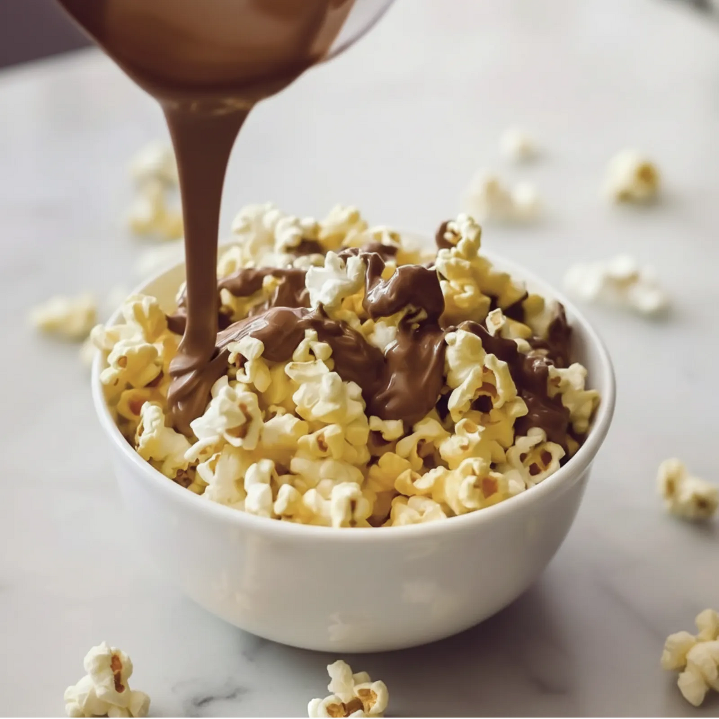 Popcorn being drizzled with milk chocolate