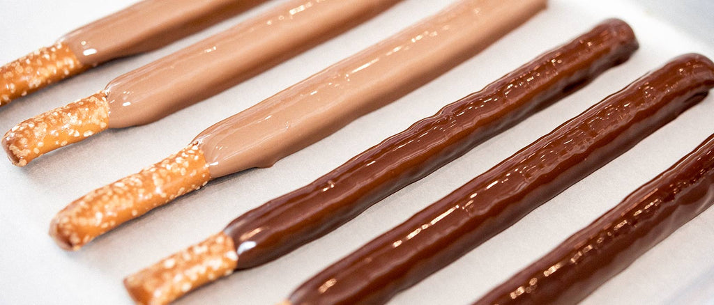 • 2 Chocolate-Dipped Pretzel Rods – crisp, salty pretzels dipped in smooth Peterbrooke chocolate.