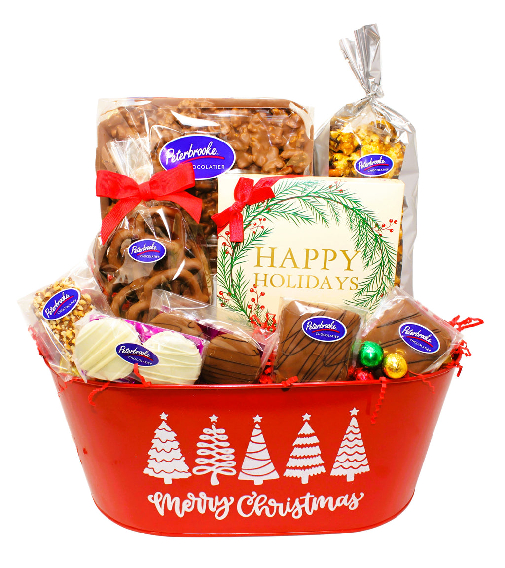 Celebrate the season with our Merry Christmas Gift Basket, a festive red tin brimming with Peterbrooke favorites. This generous assortment includes: